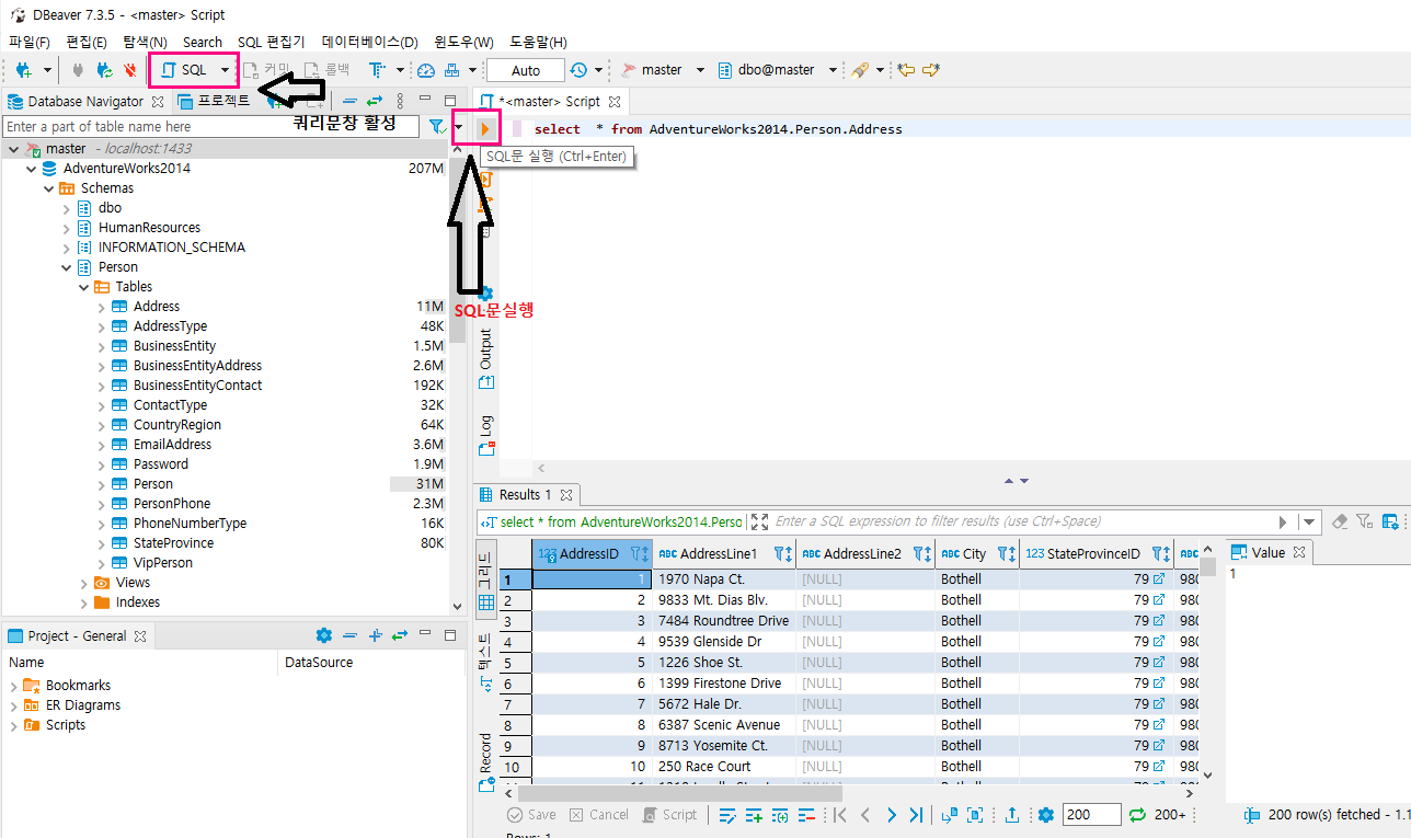 접속후 SQL메뉴를 선택하면 쿼리스크립트 창이 나타나며 쿼리문 입력후 SQL실행버튼(▶)를 클릭하며 쿼리결과를 확인할수있습니다.