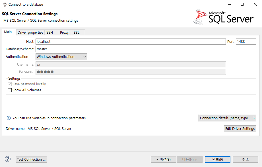 MSSQL을 선택해서 접속후 데이터를 조회해보도록 하겠습니다. SQL Server를 선택후 다음버튼을 누르면 아래와 같이 접속정보가 나타나며 접속정보를 입력후 연결해보겠습니다.