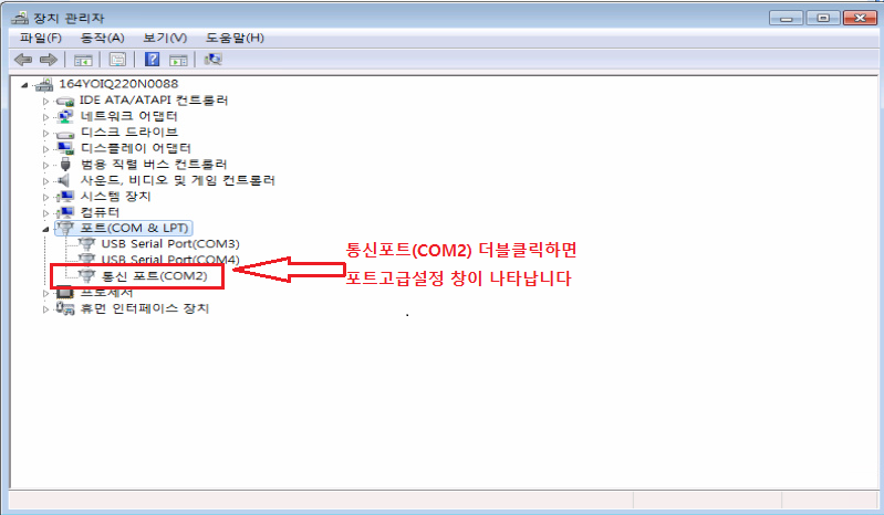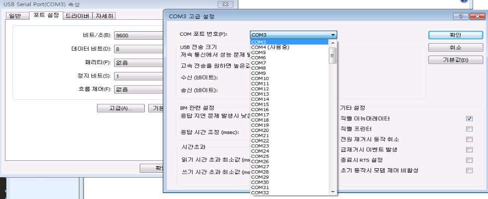 시스템에 잡혀있는 시리얼포트를 더블 클릭하여 고급설정 메뉴로 들어갑니다.
