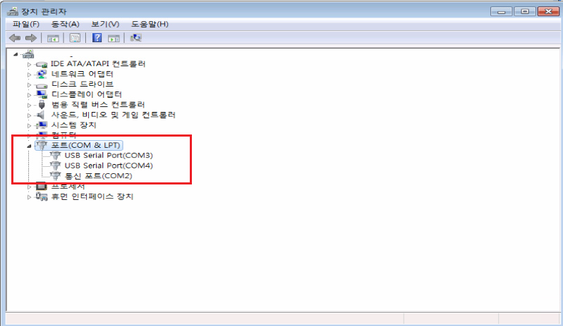먼저 장치관리자 화면으로 들어갑니다. 장치관리자에서 포트,직렬포트항목을 선택하면 시스템에 잡혀있는 시리얼포트번호를 확인할수 있습니다.