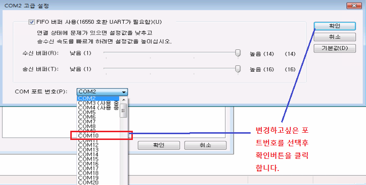 고급설정 항목의 Com포트 번호항목을 선택후 변경하고 싶은 포트번호로 선택합니다.