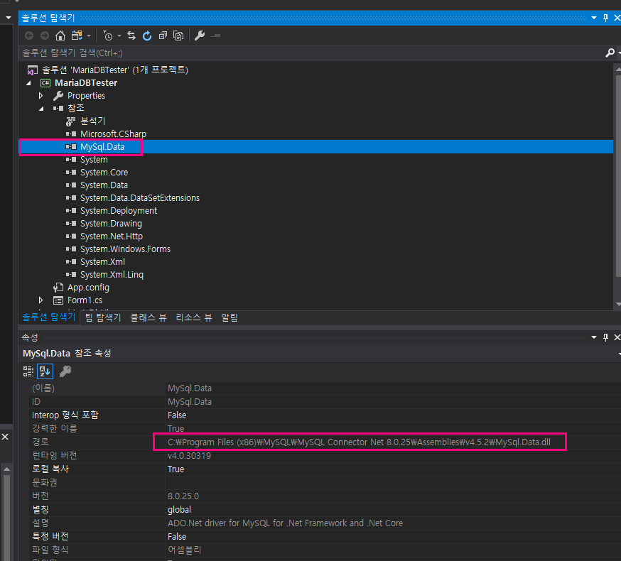C:\Program Files (x86)\MySQL\MySQL Connector Net 8.0.25\Assemblies\v4.5.2\MySql.Data.dll 을 참조합니다. 주의하셔야될 사항이 닷넷버전의 경우 4.5.2버전이상 버전을 사용해야합니다.