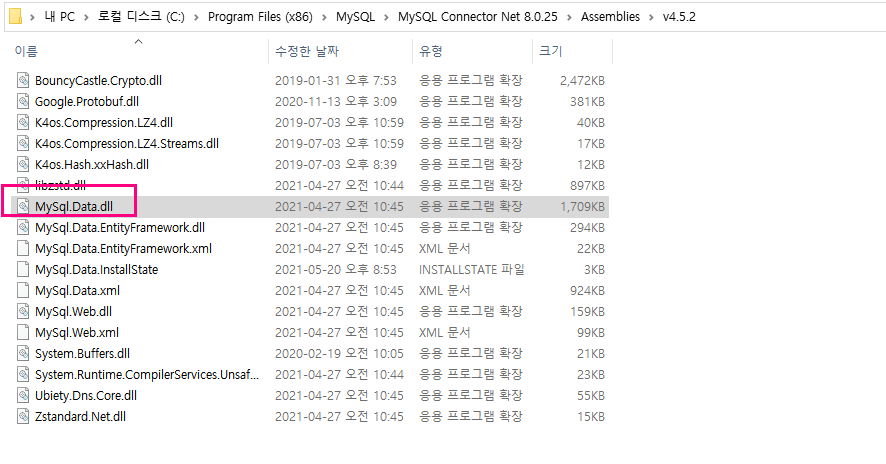 다운로드 후 설치파일(mysql-connector-net-8.0.25.msi)을 설치합니다. 설치가 완료되면 아래경로에 MySql.Data.dll 파일이 "C:\Program Files (x86)\MySQL\MySQL Connector Net 8.0.25\Assemblies\v4.5.2" 경로에 설치됩니다.