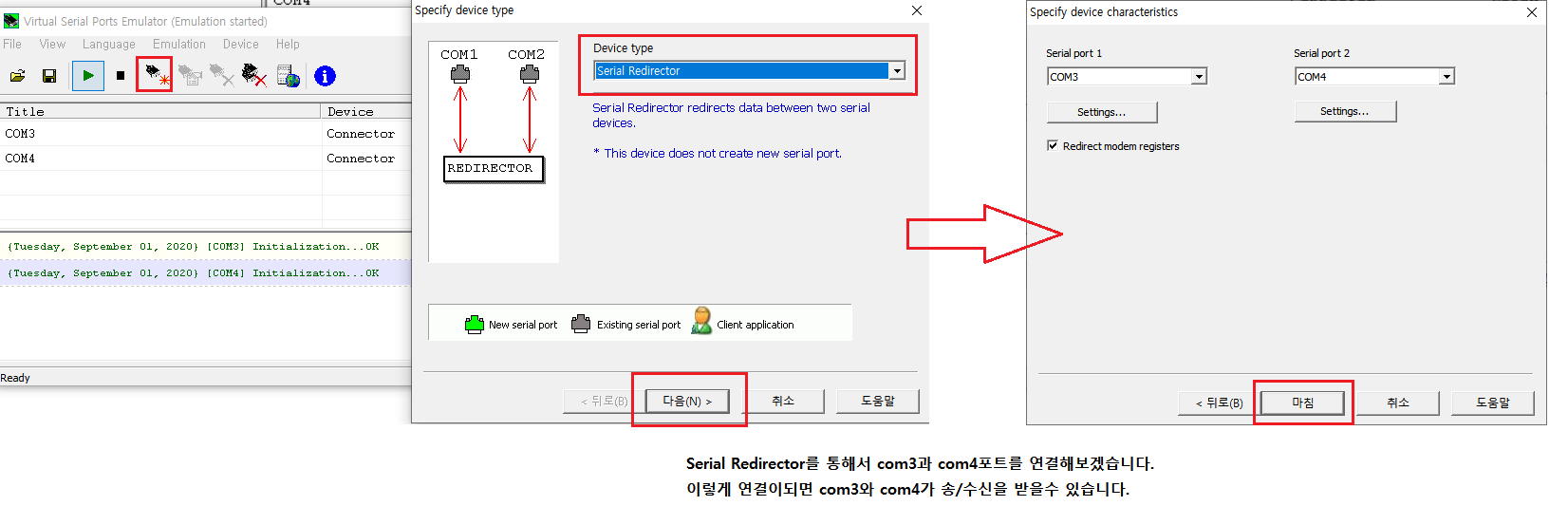 이제 COM3,COM4번이 생성이 되었으니 통신테스트를 해보겠습니다. 포트가 생성된다음에는 com3,com4포트를 서로 연결해줘야 합니다. Device Type을 Serial Redirector로 선택한후 연결할포트를 선택합니다. Com3, Com4를 선택후 마침을 클릭하면 이제 Com3, Com4포트가 서로연결됩니다.