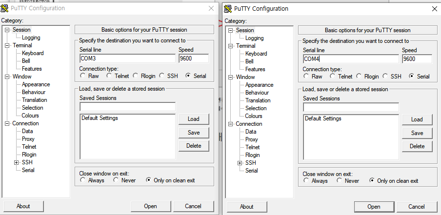 이제 포트가 연결되었으니 송수신 테스트를 해봐야겠죠. Putty프로그램을 사용해서 테스트 해보겠습니다. 한개는 Com3으로 포트를 열고, 한개는 Com4로 포트를 열어서 실행하겠습니다.