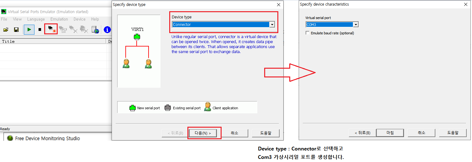프로그램을 설치후 실행한다음 Device Type을 Connector로 선택한 후 Com3번으로 가상시리얼포트를 만들어보겠습니다.