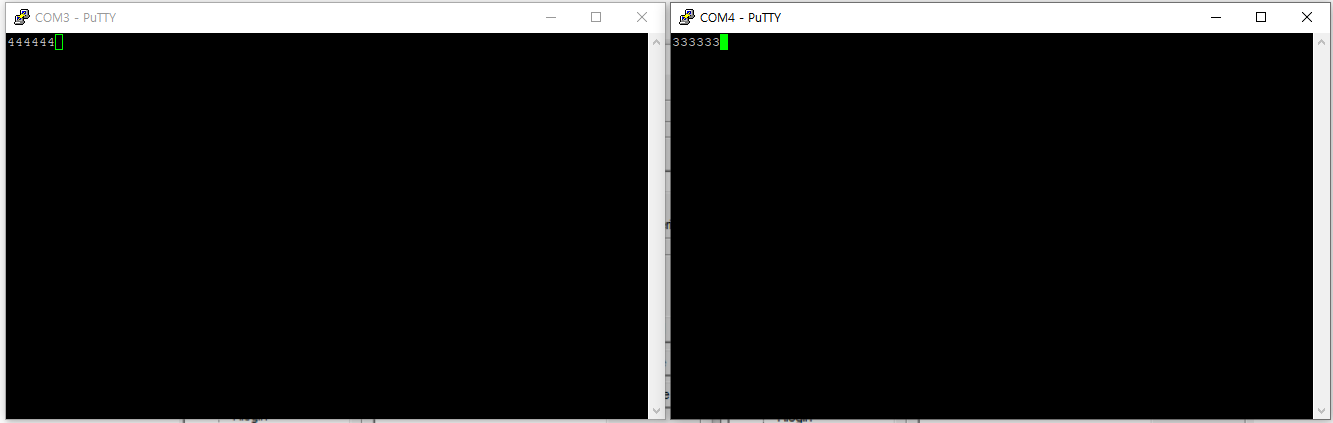 양쪽에서 서로데이터를 보내보겠습니다. COM3포트에서는 33333, COM4포트에서는 44444이렇게 보내보면 상대방 터미널에 송수신된 정보를 볼수 있습니다.