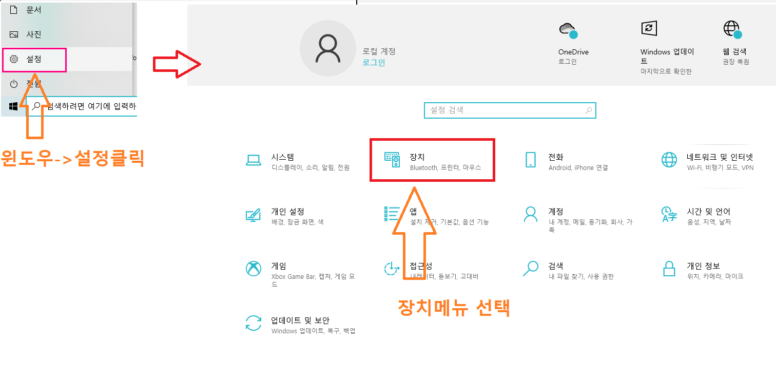 윈도우에서 메뉴에서 설정항목을 선택하면 설정메뉴가 나타나고 해당메뉴에서 장치부분을 클릭합니다.