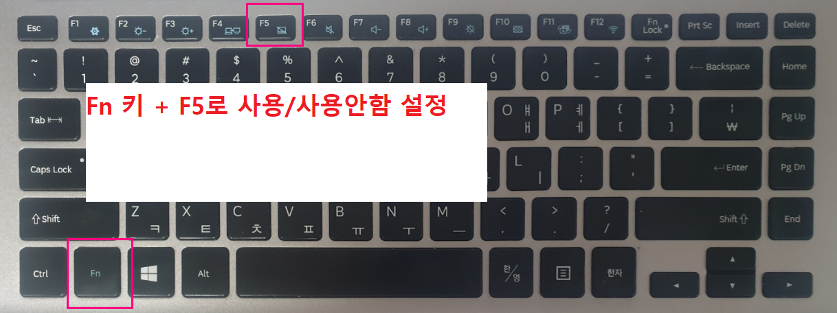 - 단축키 이용 Fn키 + F5 (마우스패드비활성). 일부 노트북모델에서만 적용이되며 해당부분이 적용됨