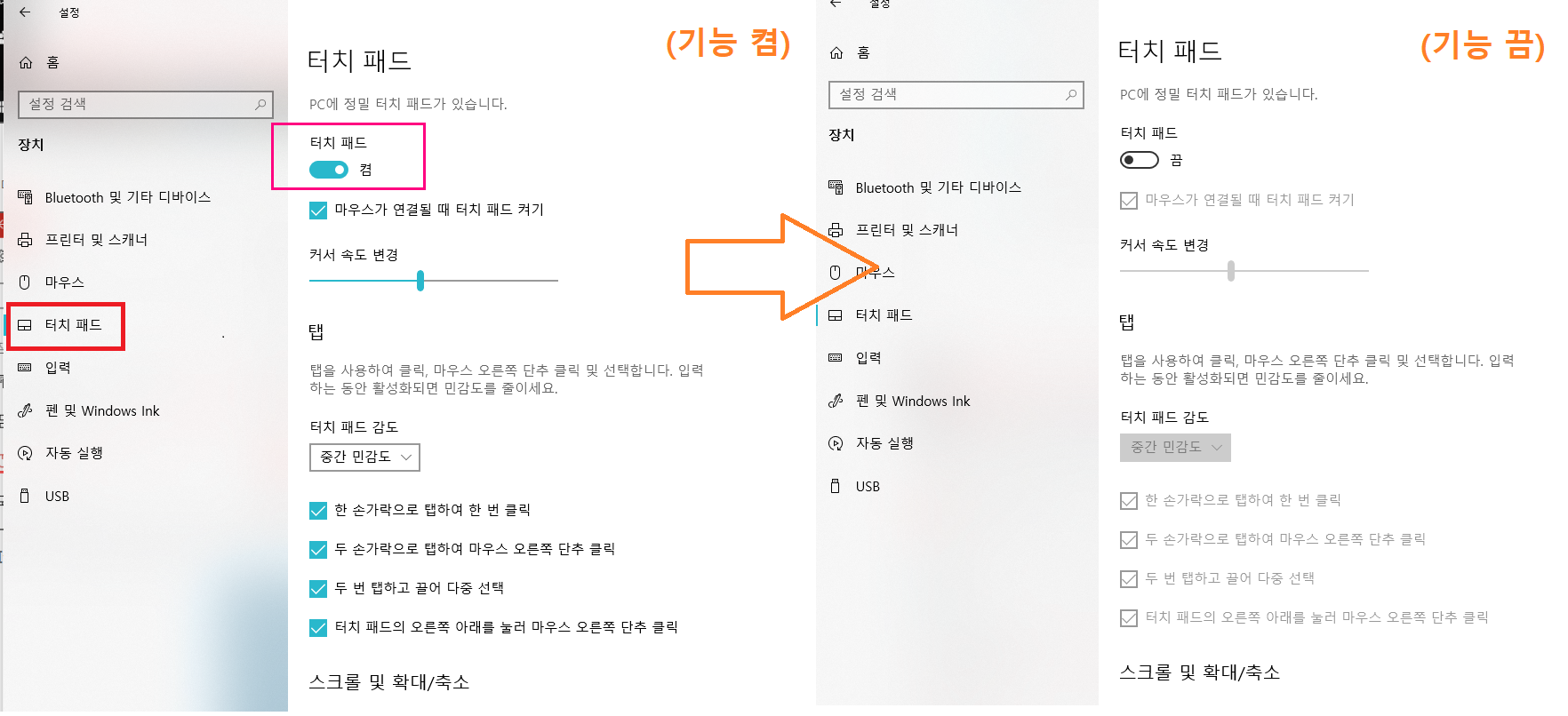 - 제어판 -> 장치 -> 터치패드 -> 켬/끔 설정처리
