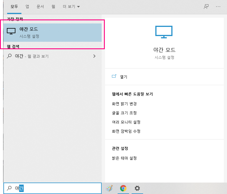 어느순간부터 갑자기 화면이 어두워져서 원인을 찾다보니 야간모드 설정이라는 메뉴가 있었습니다. 야간메뉴가 설정이 되어있어서 화면이 특정시간에 계속 어둡게 나왔습니다. 야간모드 설정/해제하는 방법에 대해 알아 보겠습니다. 윈도우 검색창에 "야간모드" 라고 검색을 하면 아래와 같이 야간모드 설정화면이 나타납니다.