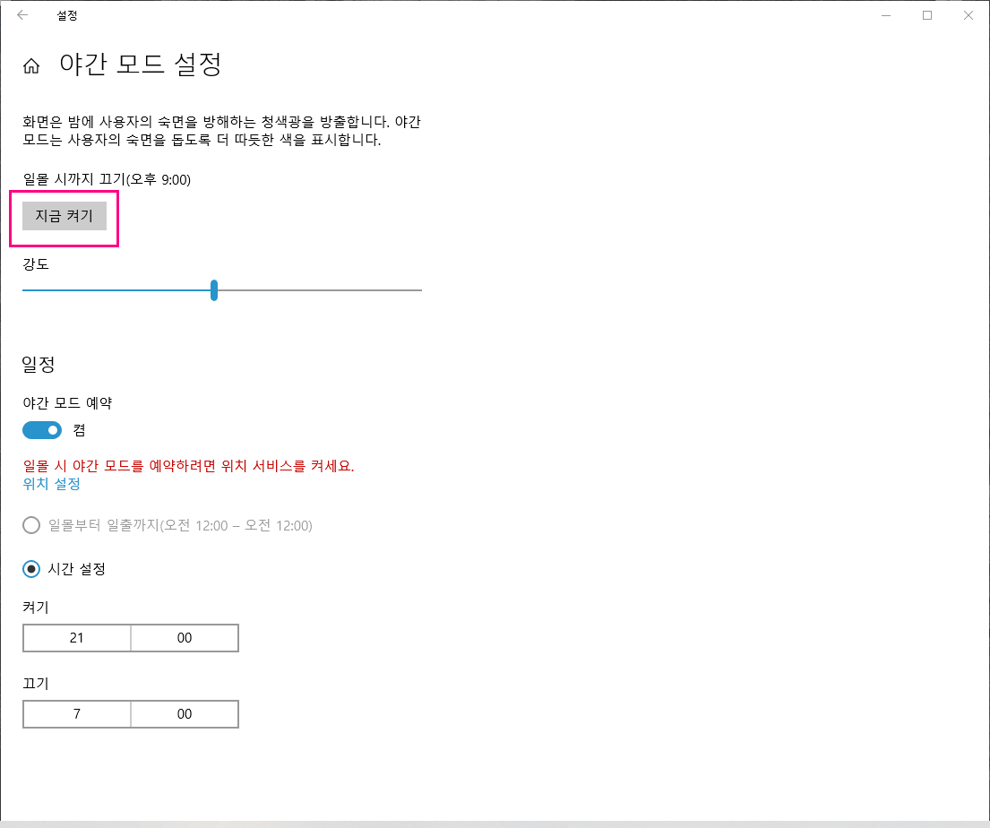 야간모드 설정화면에서 지금켜기/지금끄기 버튼을 클릭해서 야간모드를 설정 할수있습니다. 아래 야간모드 예약부분의 경우는 특정시간에 야간모드를 설정해서 블루라이트를 차단 할수 있습니다. 이것도 모르고 모니터가 고장난줄 알고 있었네요.^^
