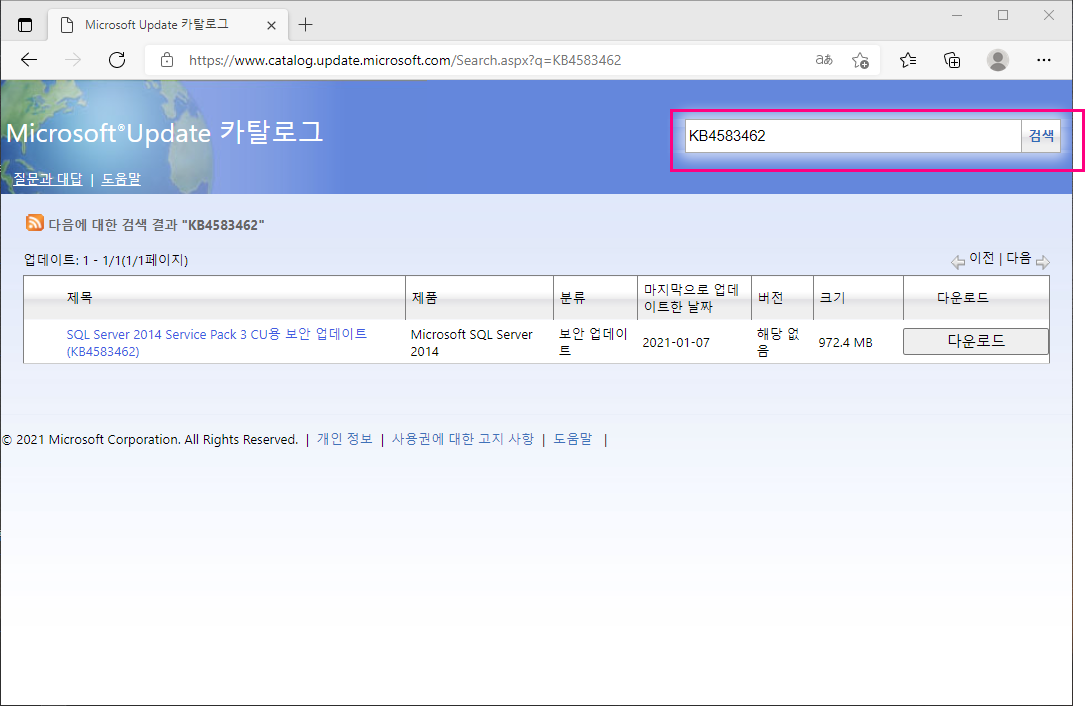 방법1) MSSQL SERVER 2014 SP3로 업데이트 주소검색후 다운로드