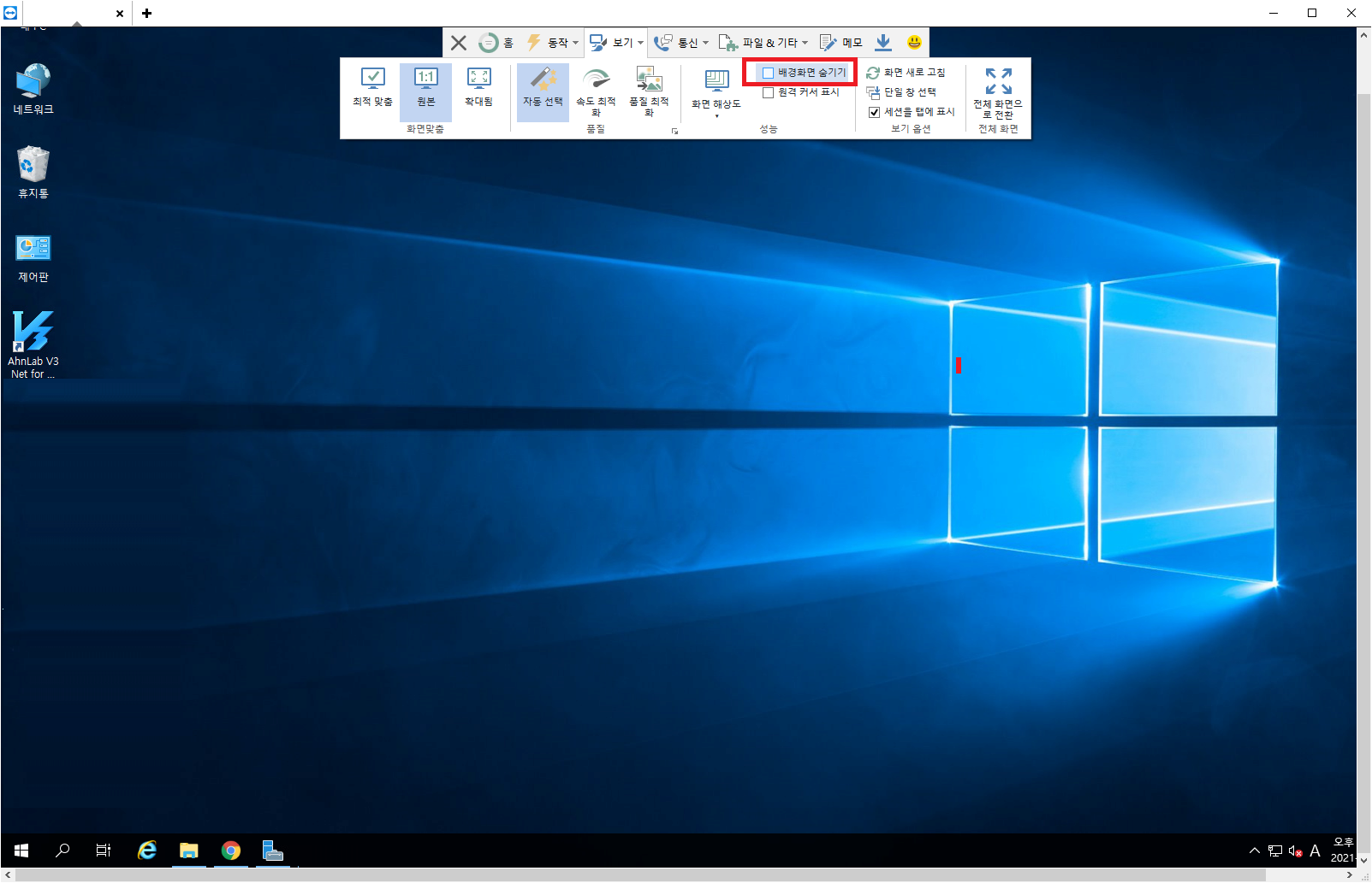 실제 원격지에 접속한후에 윈도우 화면 가운데 팀뷰어 조작메뉴 -> 보기를 클릭합니다. 배경화면 숨기기 체크박스가 있는데 해당부분에 체크를 해제하면 아래그림과 같이 바탕화면이 검게 표시되지 않고 설정된 바탕화면으로 표시되는 것을 확인할수 있습니다. "원격 커서 표시" 항목의 경우는 커서가 표시되지 않을경우 해당메뉴를 체크하면 원격지의 조작하는 커서를 표시하여 원격을 보다 원활하게 사용할수 있습니다.