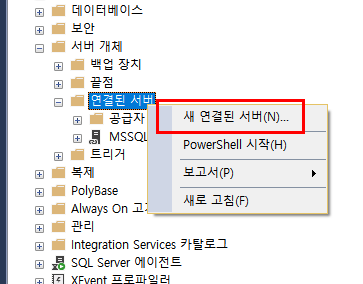 3) 마짐막으로 SQL Management Tool을 이용하여 연결서버를 설정합니다.