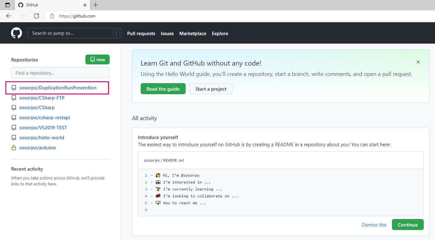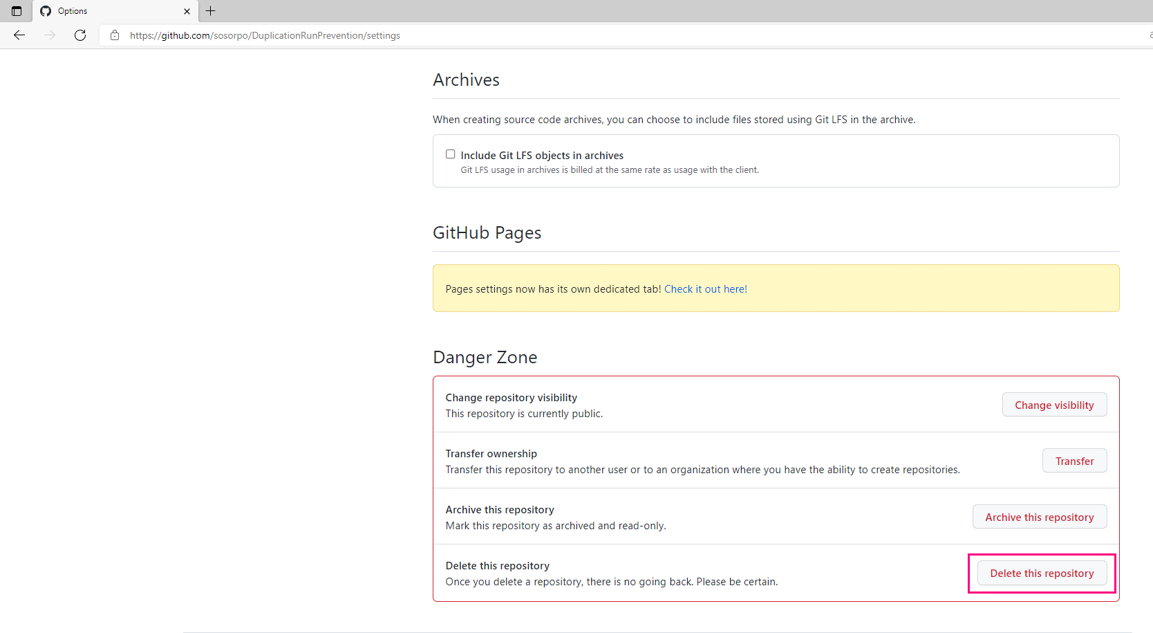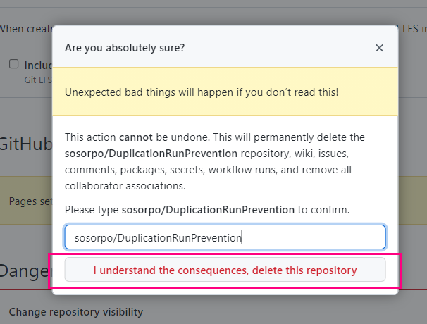 - 삭제하고싶은 저장소의 명칭을 클릭합니다. sosopro/DuplicationRunPrevention 저장소를 삭제할려고 하기때문에 해당저장소입력 후 I understand the consequences, delete this repository를 클릭하면 해당 프로젝트가 삭제됩니다.
