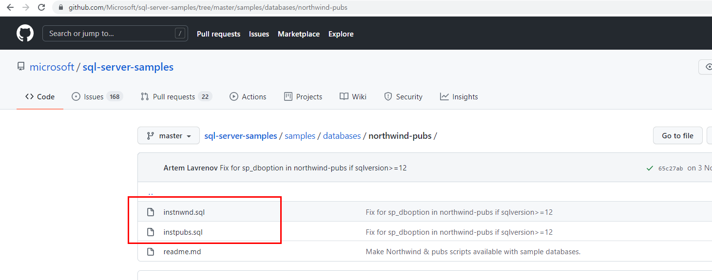 위 링크된 GitHub사이트에 접속하면 아래와 같이 instnwnd.sql, instpubs.sql 스크립트가 나타납니다.