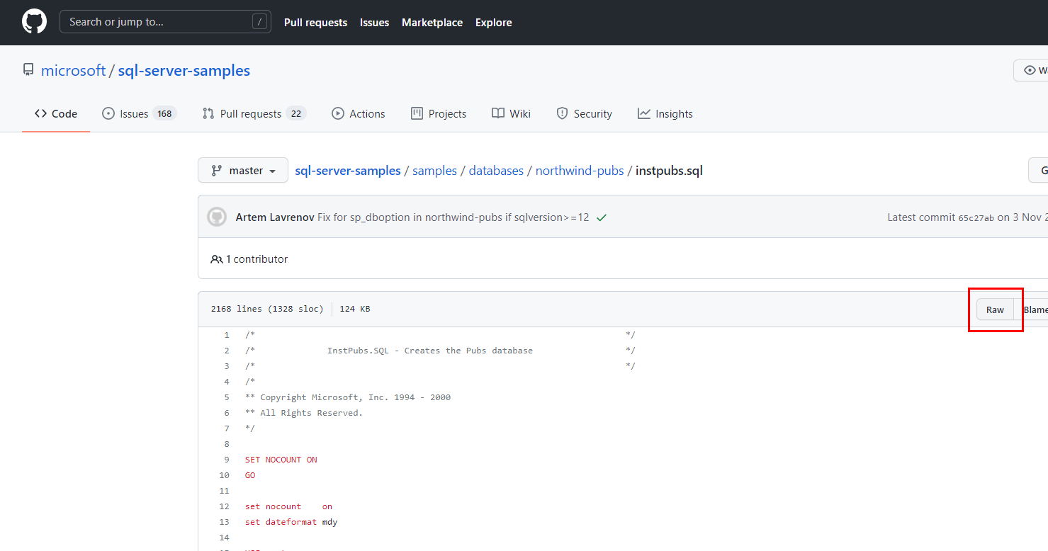 instpubs.sql파일을 선택하면 아래와 같이 스크립트 정보가 나타납니다. Raw버튼을 클릭후 해당 스크립트를 복사합니다.