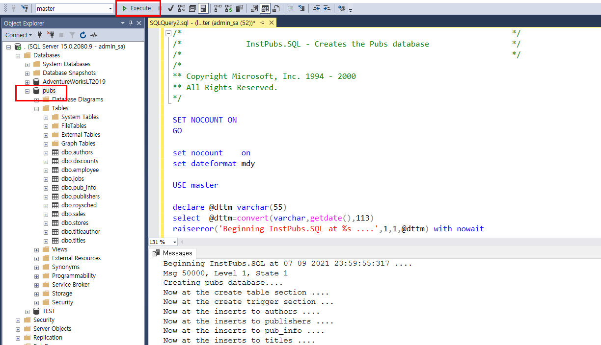 복사한 스크립트 파일을 실행하면 아래 그림과 같이 pubs 데이터베이스가 생성된것을 확인할수 있습니다. 스크립트 내용 스키마 & DATA까지 있기때문에 해당자료로 테스트를 진행하면됩니다.