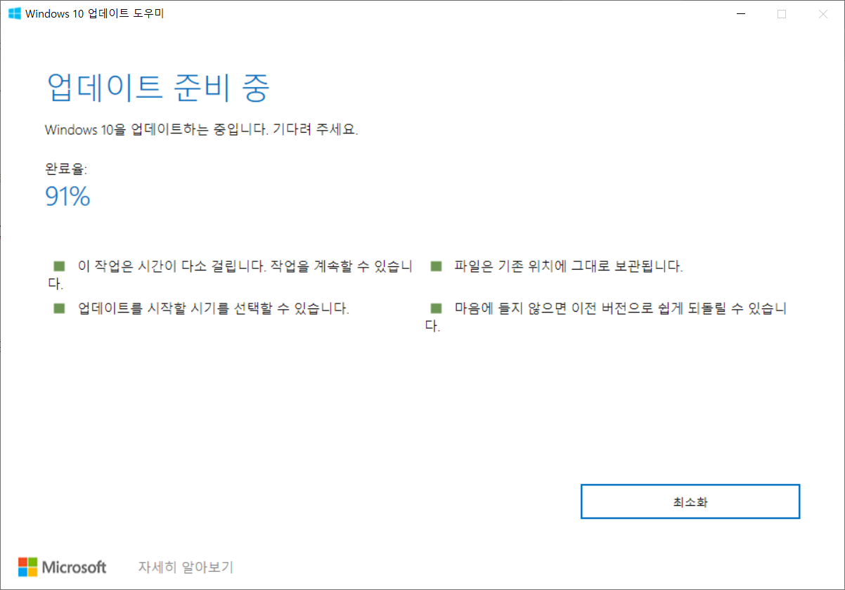 다운로드 받은 파일을 실행하면 아래와 같이 최신 버전의 Windows 10으로 업데이트를 진행합니다. PC호환유무의 메세지가 표시되며 다운로드가 시작됩니다.