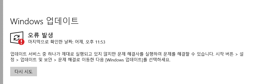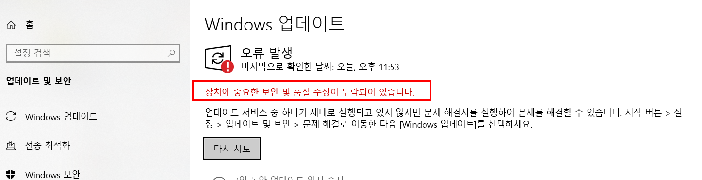 윈도우 업데이트 화면에서 오류가 발생하여 업데이트가 되지 않는 현상이 발생했습니다. "장치에 중요한 보안 및 품질 수정이 누락되어 있습니다" 라는 에러메세지가 나타났고 재부팅 및 다시시도를 해보았으나 해결이 되지 않았습니다.