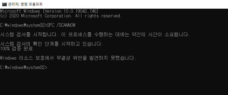 명령 프롬프트를 이용해서 SCANNOW를 하였는데도 해결되지 않았습니다.