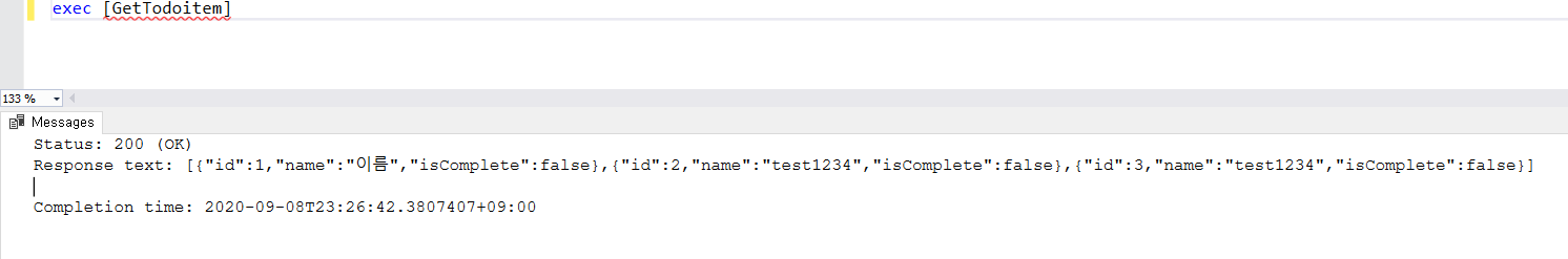 AddTodoItem 프로시저 호출결과입니다. 아래와 같이 Status 상태값 201로 test1234관련 고객정보가 등록된부분을 확인 할수 있습니다.