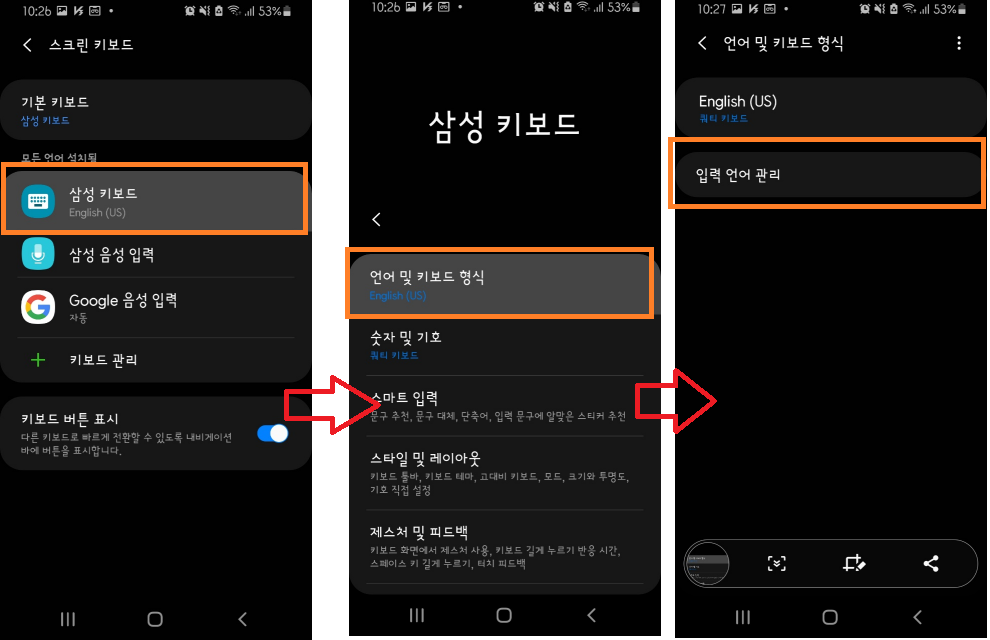 설정 -> 일반 -> 언어 및 입력방식 -> 스크린 키보드 -> 삼성키보드 -> 언어 및 키보드 형식 -> 입력 언어관리