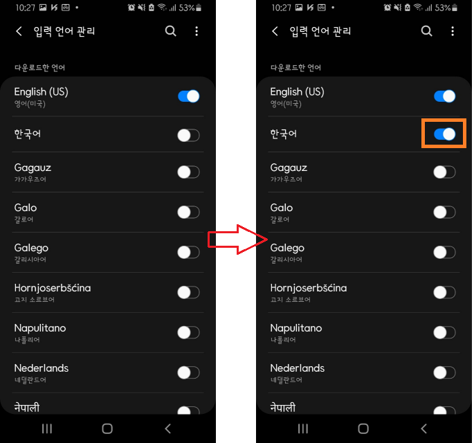 한국어를 활성화 했기때문에 키보드 입력화면을 보면 한/영키가 활성화 된것을 볼수있습니다. 이처럼 언어설정으로 원하는 언어 설정이 가능합니다. 저같은 경우 해당메뉴가 어디있는지 찾지 못해서 한참해메었습니다. 일본어/중국어등 원하는 언어를 활성화 해서 사용가능 하니 참고하시기 바랍니다.