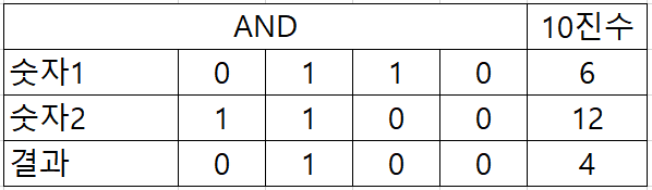 AND연산은 두개의 비트가 1인경우에 1을 처리합니다. 그 외의 경우는 0으로 처리됩니다.