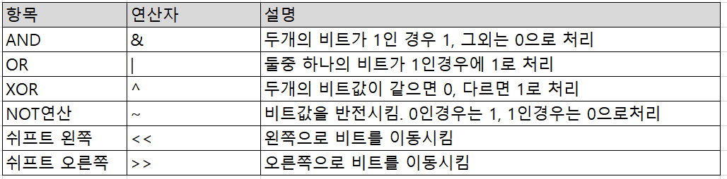 비트연산에 대해 알아보겠습니다. 정확히는 bitwise연산입니다. 비트에 대한 값을 연산하는 부분으로 이진수에 대한 데이터를 연산처리합니다.