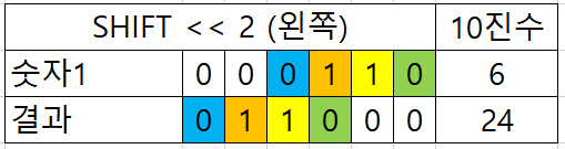 쉬프트 연산은 비트를 지정한 숫자 만큼 이동 시킵니다. 왼쪽 쉬프트 << 는 왼쪽으로 이동시킵니다. 아래는 왼쪽으로 2칸 쉬프트한 부분입니다. 2진법이므로 왼쪽으로 1칸씩 이동할때마다 2배씩 증가되는 것을 확인 할수 있습니다. 아래부분을 보면 << 1을 한경우 6 * 2 =12 , << 2 의경우는 6 * 2 * 2 = 24가 되는것을 확인 할 수 있습니다.