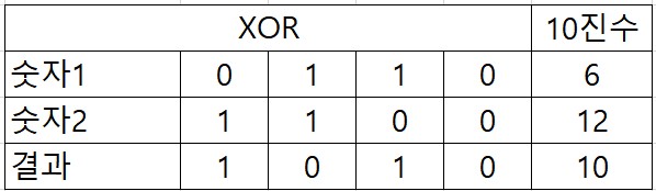 XOR연산은 두개의 비트가 값이 같으면 0으로, 다르면 1로 표기합니다. XOR연산은 매번 해깔리긴합니다.