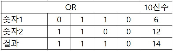 OR연산은 두개의 비트 중 하나라도 1이면 1로 표기하고 , 두 비트가 모두 0인경우에는 0으로 표기합니다.