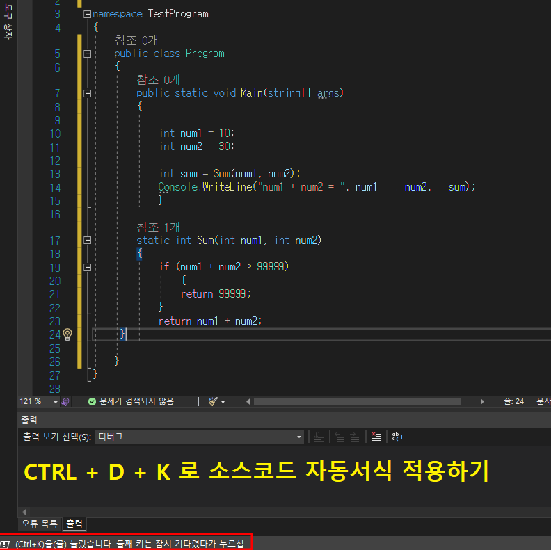 CTRL + D 키를 한번 다시 눌러주면 아래와 같이 비주얼스튜디오의 기본 자동서식으로 맞쳐줍니다. 자동 서식을 거의 변경하는 경우가 없기때문에 소스코드 작업하다가 한번씩 해주면 자동으로 보기 좋게 맞쳐주니 유용하게 사용하시기 바랍니다.