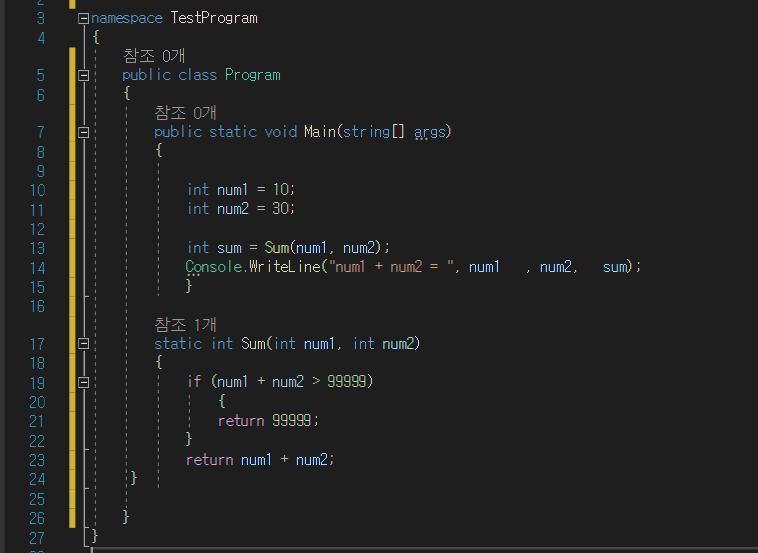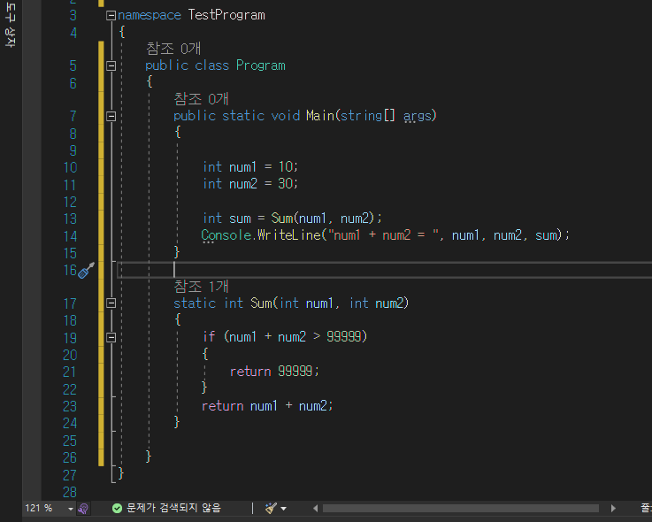 비주얼스튜디오의 단축키중에 소스코드를 자동서식을 맞추는 방법을 알려드리겠습니다. CTRL + K + D 를 사용하면 자동 서식으로 맞쳐줍니다. 아래 소소코드를 보면 라인별로 공백도 제대로 맞지 않고 { 위치도 맞지 않고 한것을 볼수 있습니다. 물론 아래와 같이 코드를 작성하시는 분은 없겠지만 이해를 돕기 위해서 공백과 "}" 위치를 맞지않게 작성하였습니다.