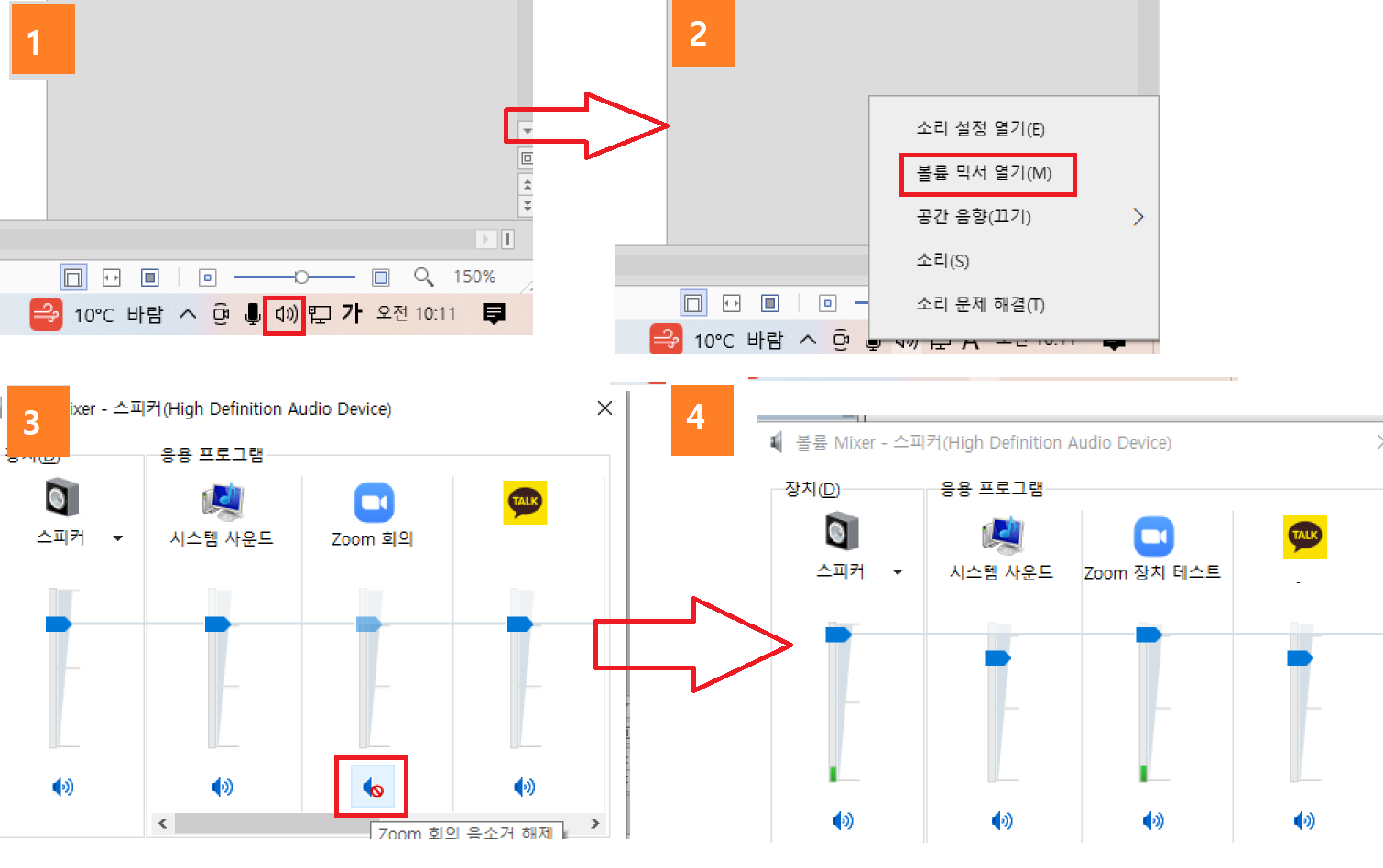 4. Zoom회의 항목 음소거해제 후 정상적으로 음성출력되는지 확인
