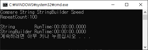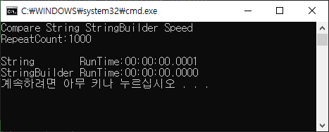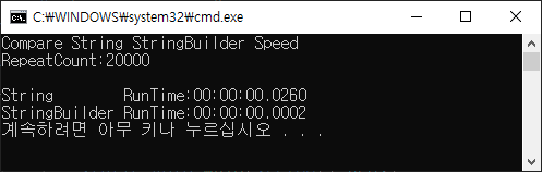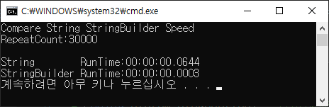 REPEAT_COUNT값을 100회, 1000회, 10000회, 30000회로 바꾸어서 속도를 측정해보았습니다. 속도를 측정하기 위해서 stopwatch클래스를 사용했습니다. 100회 반복해서 연산을 했을경우는 속도차이가 거의 나지 않습니다. 10000회의 경우 55배의 차이 30000회의경우는 210배정도의 차이가 납니다. 이처럼 반복회수가 많아지면 질수록 성능에 차이가 발생하므로 string연산이 많이 이루어지는곳에는 StringBuilder클래스를 사용해서 사용하는것이 좋습니다.