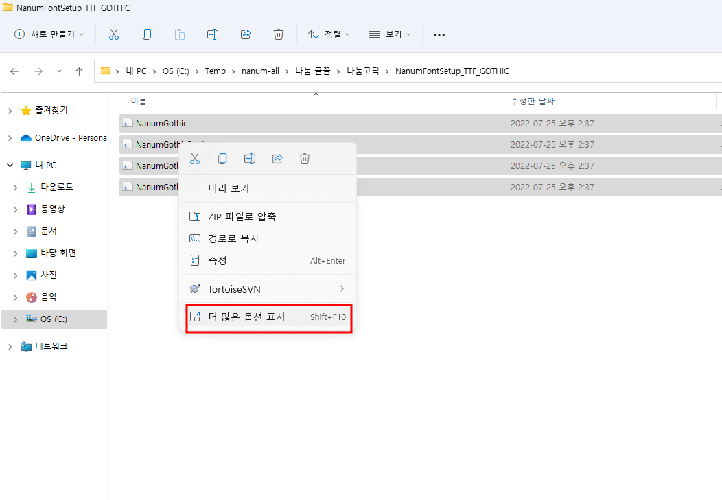 다운로드된 폰트에서 나눔고딕 폰트를 선택합니다. OS가 윈도우이므로 윈도우용(TTF)을 설치하도록 하겠습니다. 마우스 우클릭 하여 더 많은 옵션 표시 버튼을 클릭합니다.