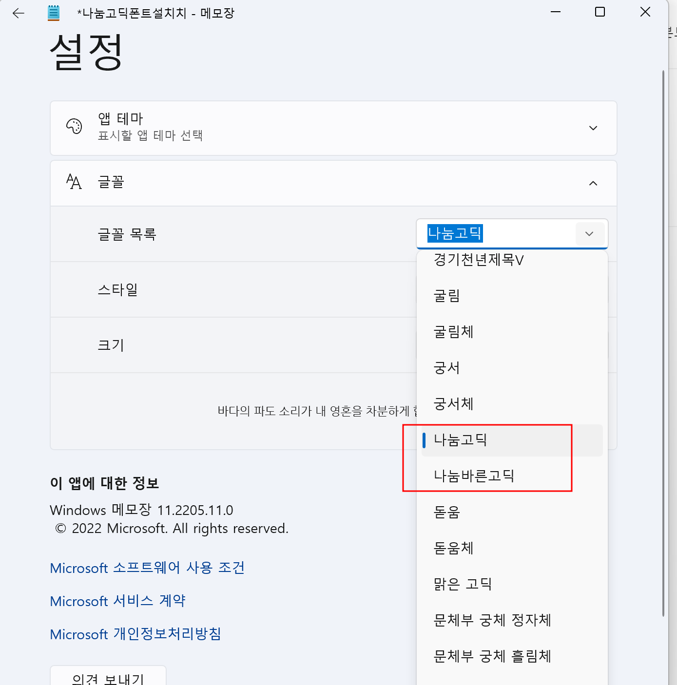 이제 폰트가 정상설치되었는지 확인 해보겠습니다. 메모장 프로그램에서 글꼴 정보를 확인하면 아래와 같이 설치된 폰트정보를 확인 할 수 있습니다.