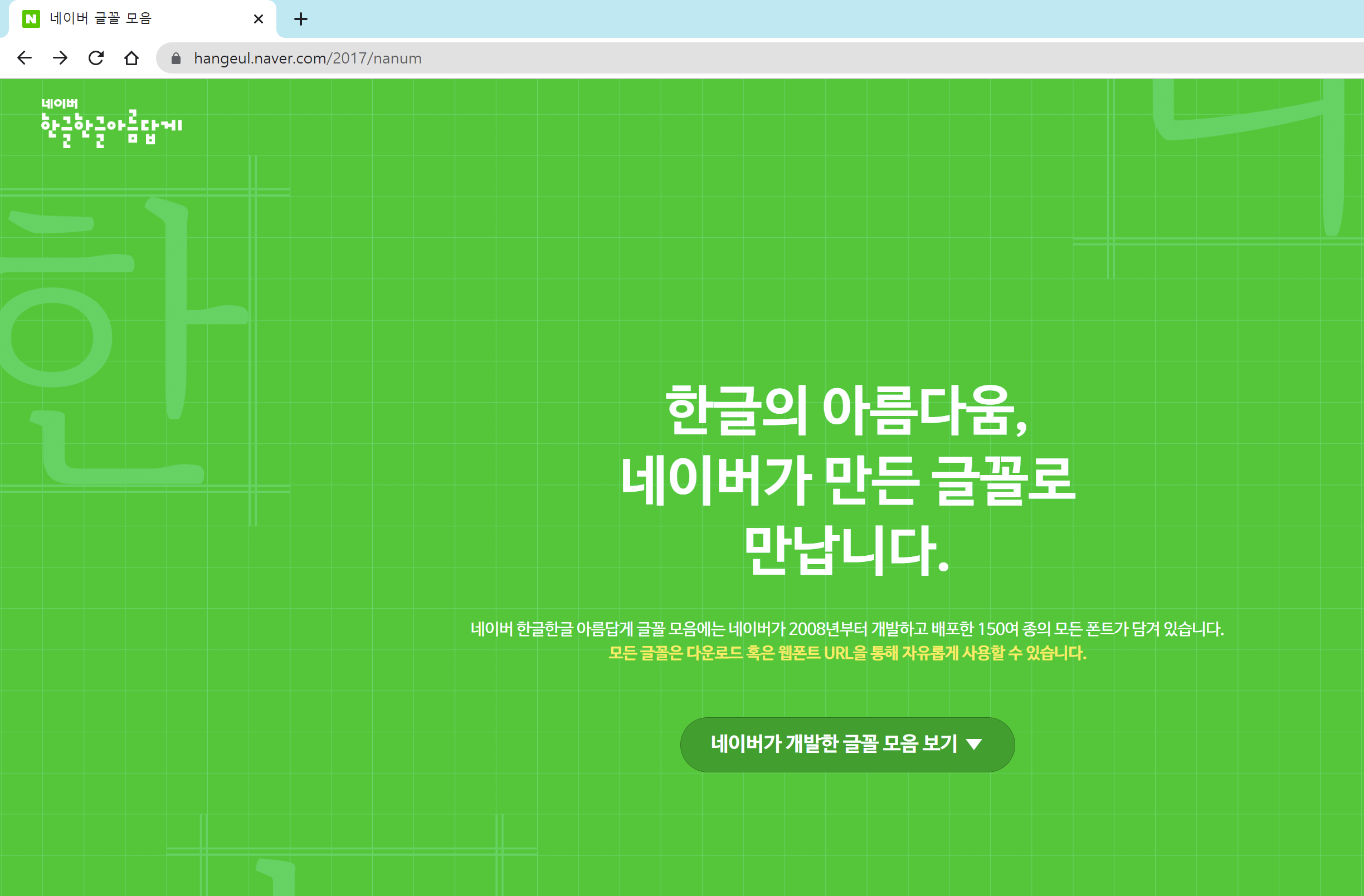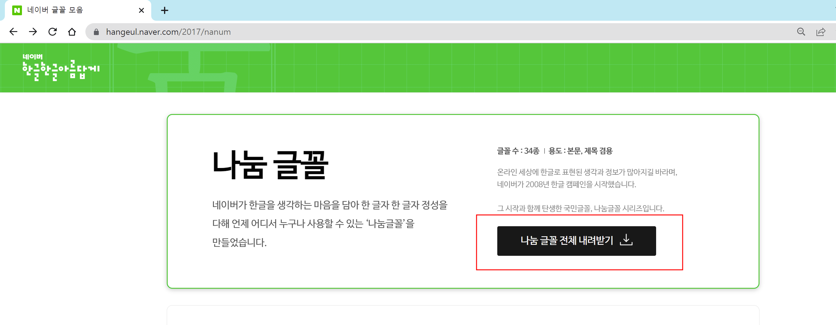 https://hangeul.naver.com/2017/nanum 링크에서 네이버글꼴 다운받습니다. 나눔글꼴 전체를 다운로드 하면 여러종류의 나눔글꼴을 다운로드 받을 수 있습니다.