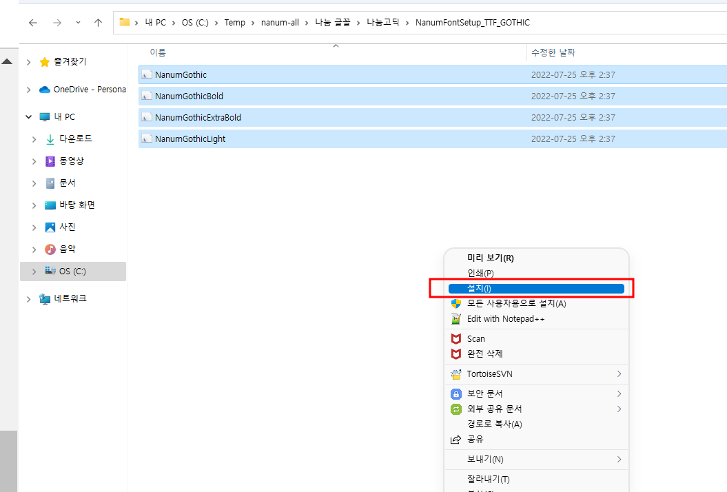 설치메뉴를 선택하면 해당 폰트가 설치됩니다.