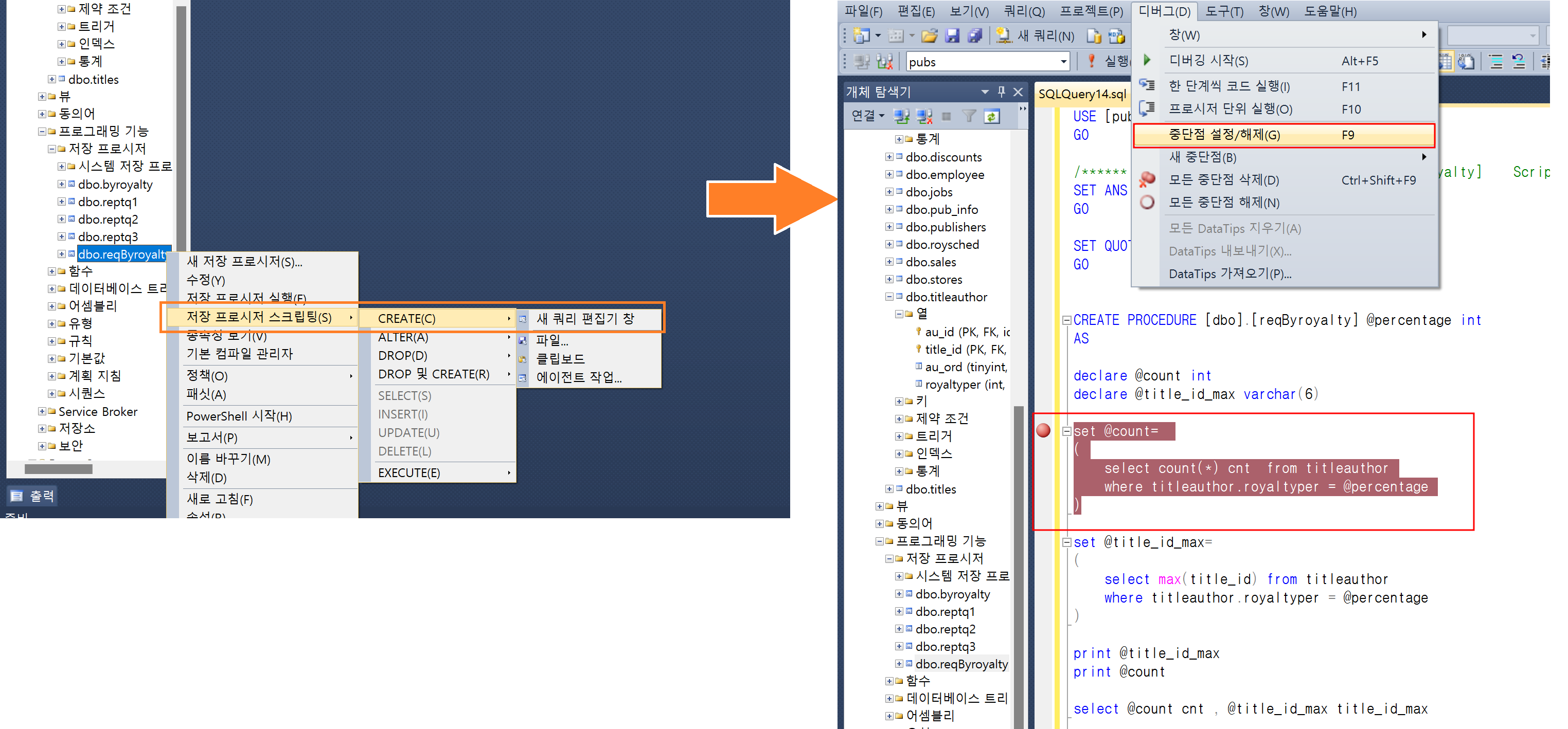 디버깅 하고 싶은 프로시저항목에서 저장프로시저스크립팅->Create, Alter선택합니다. 새쿼리창에 스크립트가 나타나면 디버그 하고싶은 위치에 F9키를 사용하여 중단점 설정을 합니다. F11는 한단계씩 코드실행, F10은 프로시저 단위 실행이니 디버깅시 적절히 사용하면됩니다.