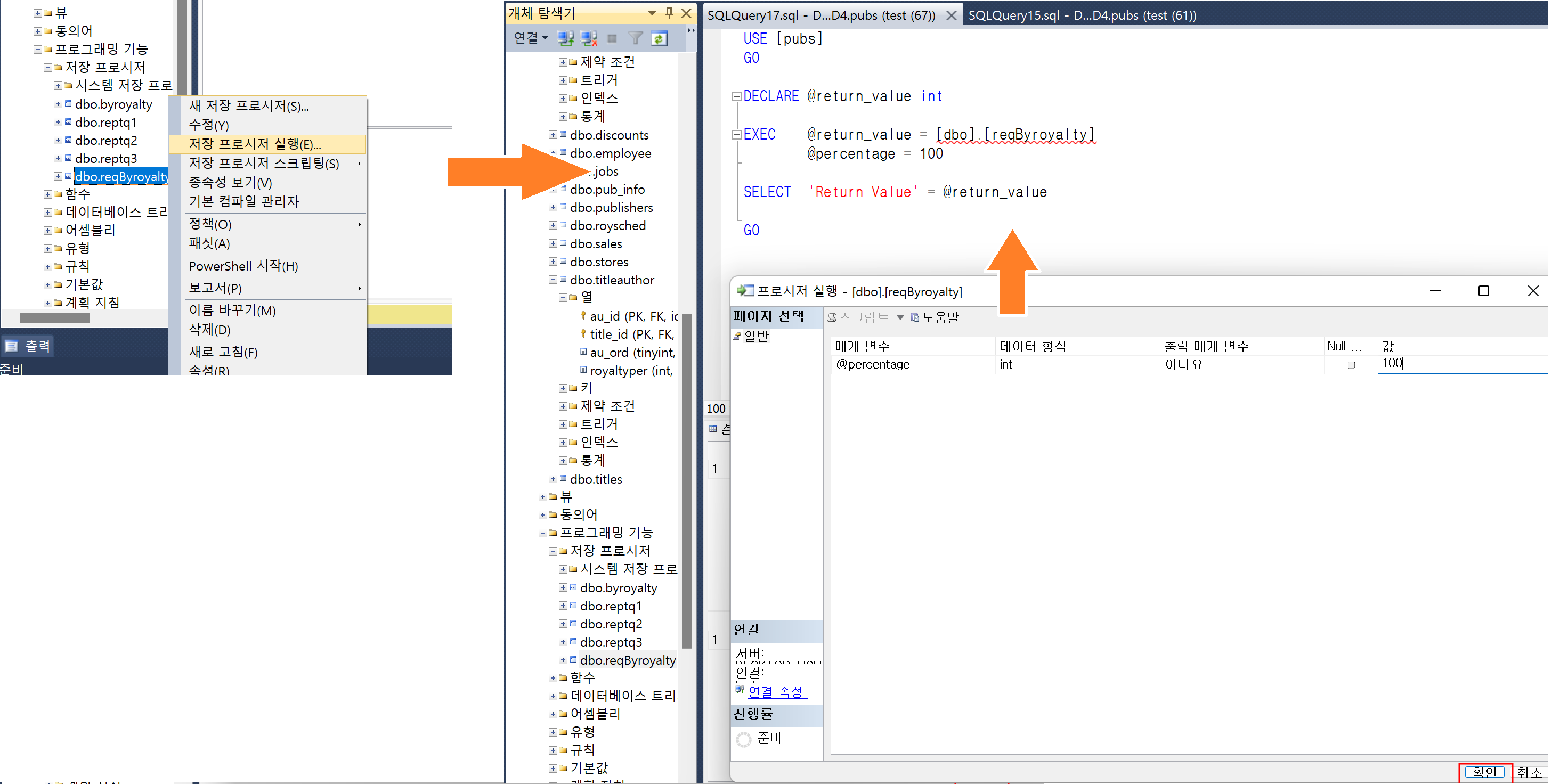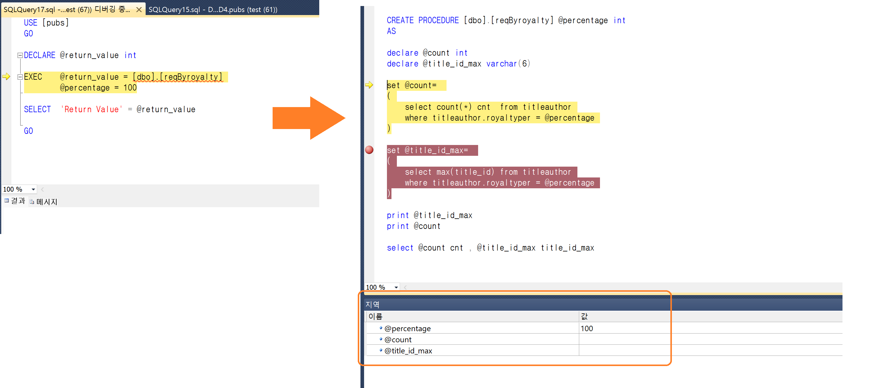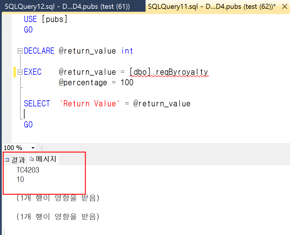 먼저 Pubs 데이터베이스에 아래와 같이 reqByroyalty 프로시저 생성합니다. titleauthor테이블의 percentage의 개수와 title_id의 max값을 리턴받는 프로시저를 만듭니다. print문을 사용해서 테스트값을 출력해서 확인하는 방법이 있습니다.
