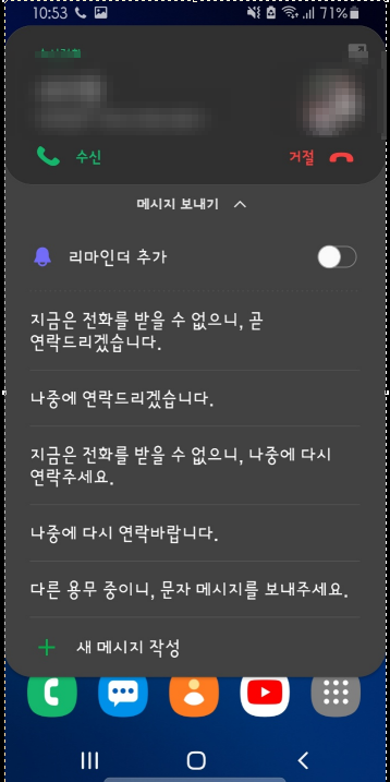 업무중이거나 중요한일을 하고있을때 전화가 오는 경우 전화를 받지 못할때가 있는데 이때 거절문자를 정해진 메세지이외에 별도로 설정하고 싶은 경우가 있습니다. 거절메세지 추가하는 방법에 대해서 알아보겠습니다. 먼저 전화가 오면 기본적으로 메세지 보내기에 아래와 같이 사전설정된 문자메세지가 나타납니다. 이 항목을 선택하면 상대방에게 해당문자 메세지가 전송됩니다.
