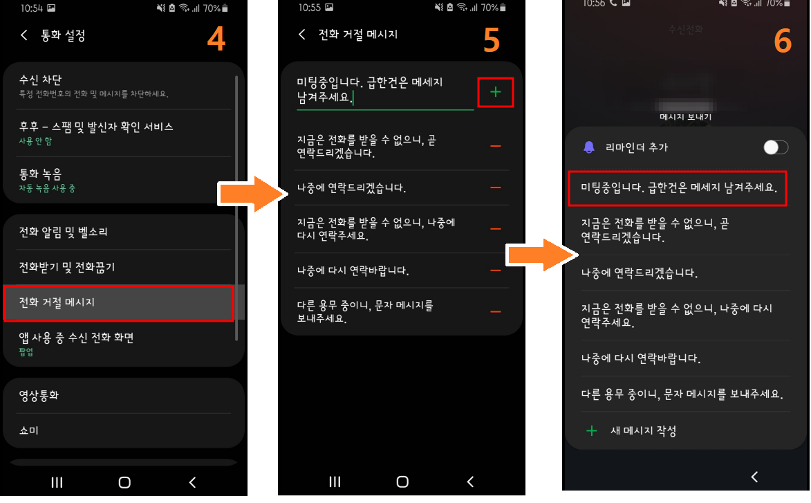 4.통화설정 -> 전화거절 메세지 선택