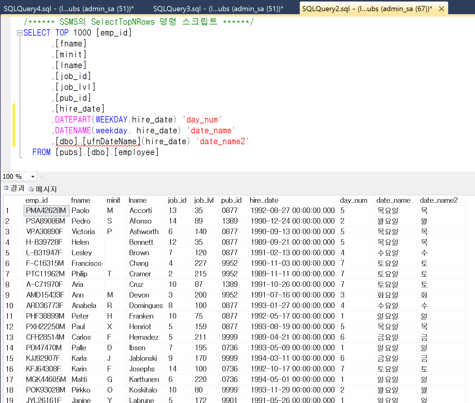 [dbo].[ufnDateName](hire_date) 와 같이 사용자 함수를 호출 하면 요일값이 일,월,화,수...,토와 같이 한글자만 반환되는 부분을 확인 할 수 있습니다.
