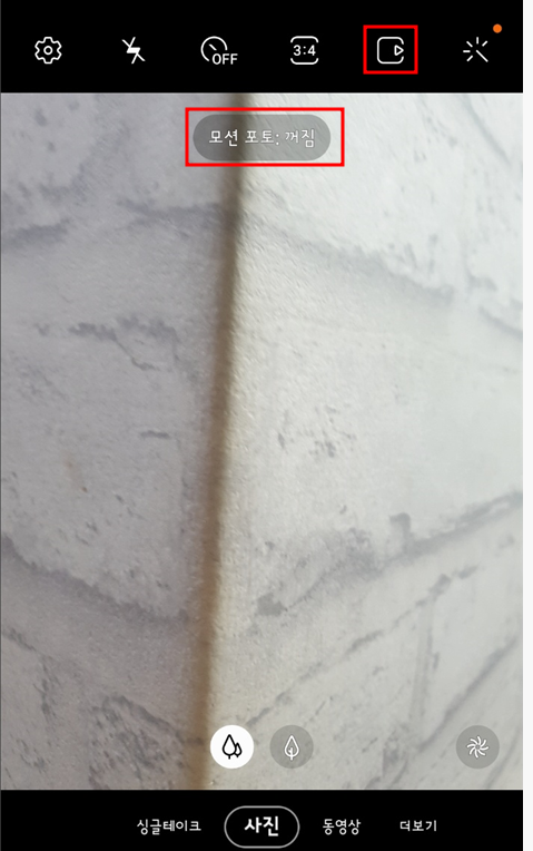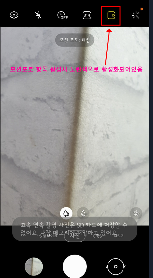 카메라 촬영시 화면 상단에 모션 포토기능이 활성시 노란색으로 활성화 된 부분을 확인 할 수 있습니다.