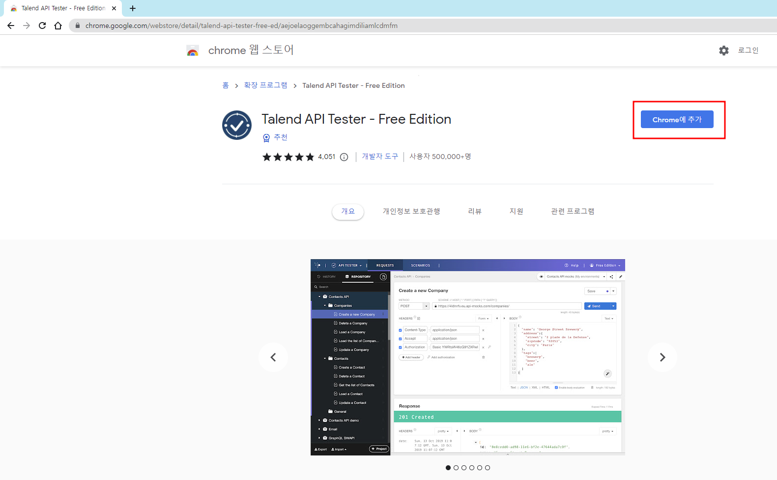 REST API테스트프로그램을 기존에는 Postman을 많이 사용하다가 설치를 해야되서 설치를 하지 않는 프로그램을 알아보다가 Chrome에 확장프로그램으로만 설치하면 무료로 사용 할 수 있어 Talend API 프로그램을 자주 사용하고 있습니다.