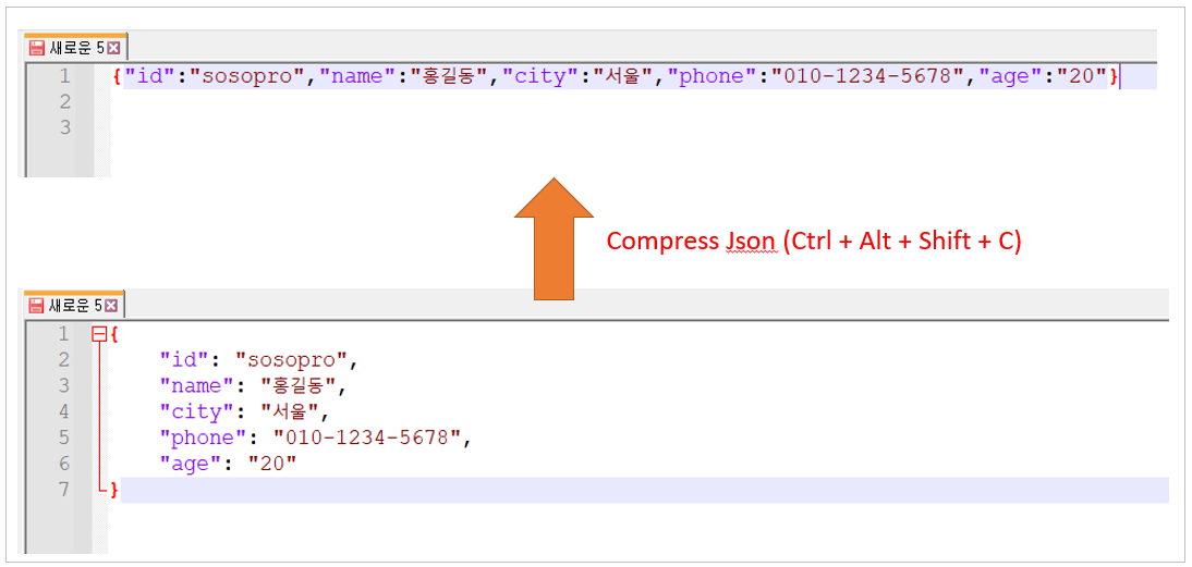 Compress Json : Json데이터를 개행문자,공백정보를 제거하여 최소화한 데이터로 변환하여 보여줍니다.